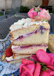 Mit der restlichen Creme die Torte an der Oberseite und an den Seiten einstreichen, Löcher stopfen und die Creme dann an den Seiten wieder abnehmen, damit der Semi Naked Look entsteht. Das klappt am besten mit einer Winkelpalette, aber auch ein Messer oder ein Teigschaber funktionieren. Die Torte wird zum Schluss nach Belieben mit Früchten und Blüten dekoriert.